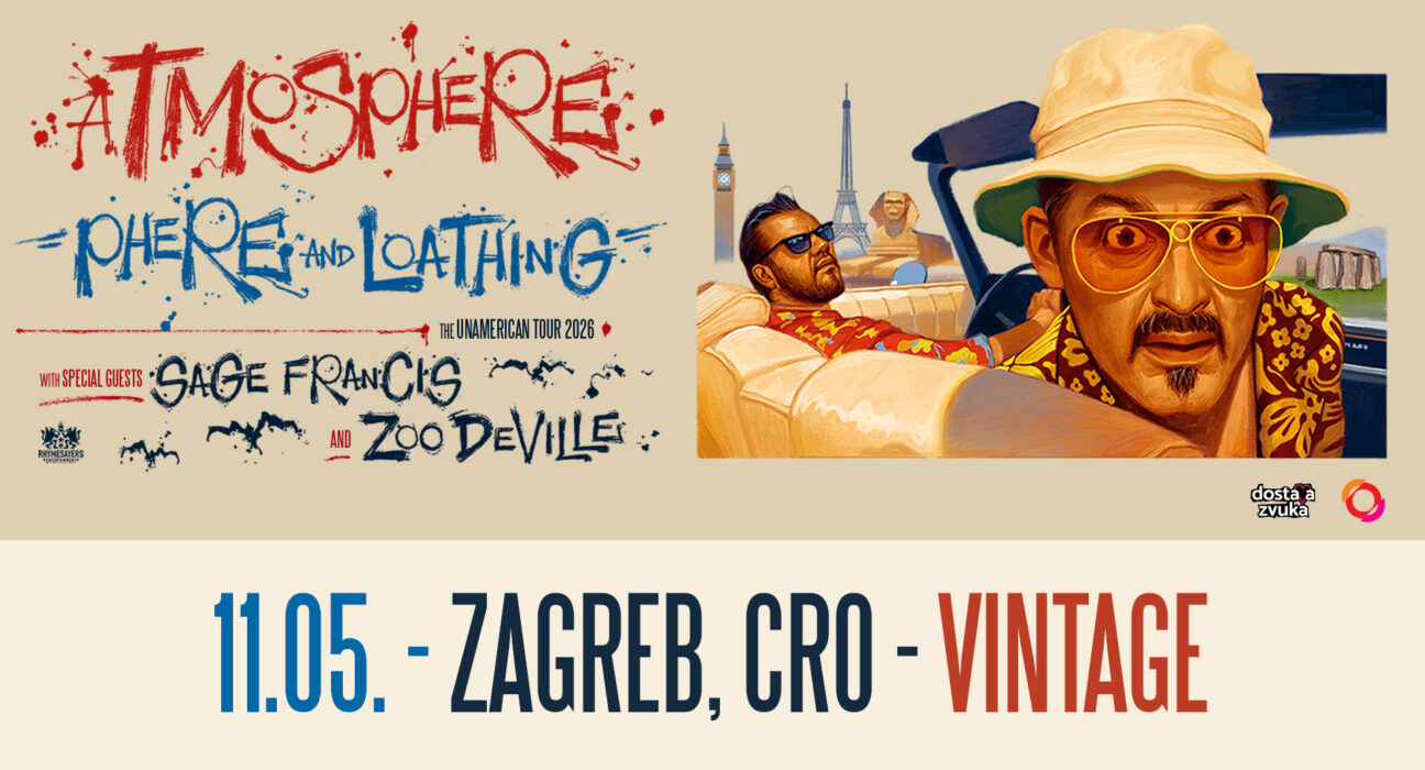 Atmosphere dolaze u okviru turneje “Phere and Loathing – The Unamerican Tour 2026”, a na pozornici će im se pridružiti i posebni gosti Sage Francis te ZooDeVille, koji će nastupiti kao predgrupa i zagrijati atmosferu prije glavnog nastupa. Ulaznice za zagrebački koncert u prodaju kreću 23. siječnja u 10 sati, a mogu se nabaviti putem sustava Entrio i u Dirty Old Shopu.
