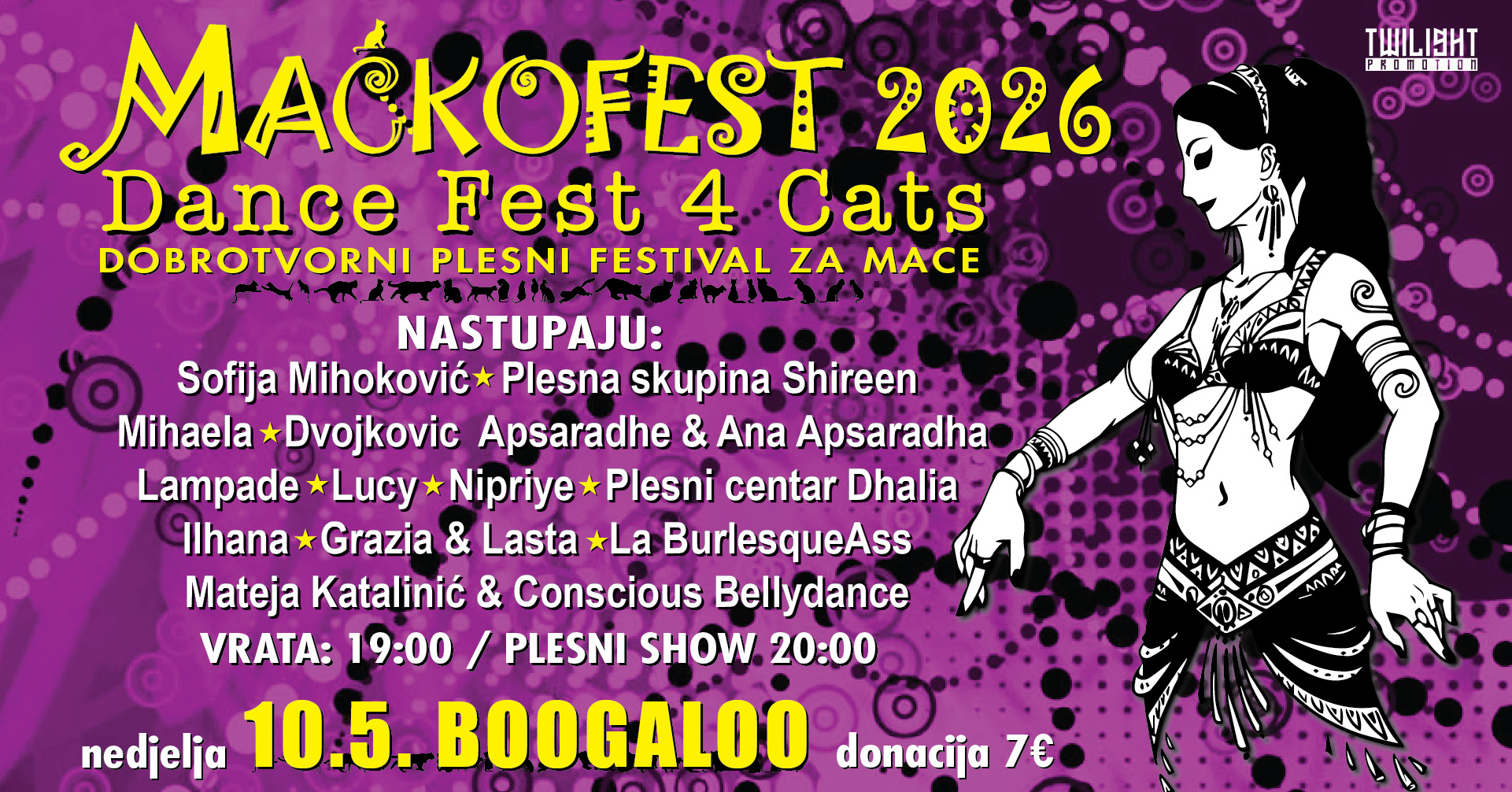 Nakon osam uspješnih izdanja dobrotvornog plesnog festivala Mačkofest, ove godine se nastavlja tradicija, tj deveto izdanje Mačkofesta, koje će s održati u nedjelju 10.05.2026. s početkom u 19:00 sati u zagrebačkom popularnom klubu Boogaloo na kojem će nastupiti desetak plesnih grupa i plesačica.