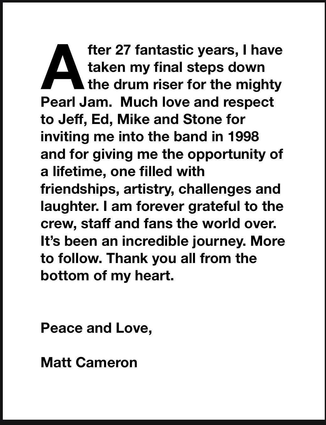 „Nakon 27 fantastičnih godina, napravio sam svoje posljednje korake s bubnjarskog podija za moćni Pearl Jam. Puno ljubavi i poštovanja Jeffu, Edu, Mikeu i Stoneu što su me pozvali u bend i pružili mi priliku života… Zahvalan sam ekipi, osoblju i fanovima širom svijeta. Bilo je to nevjerojatno putovanje.“