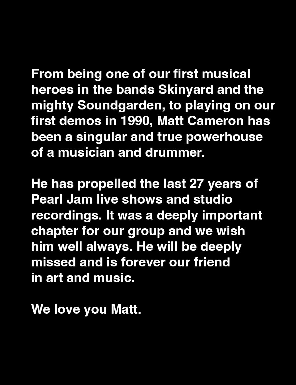 „Matt Cameron bio je jedan od naših prvih glazbenih heroja još iz vremena Skinyarda i moćnog Soundgardena. Od prvih demo snimaka 1990. pa sve do danas, bio je istinska snaga kao glazbenik i bubnjar. Propulsirao je posljednjih 27 godina koncerata i snimanja, ostavio dubok trag na našu grupu i uvijek će biti naš prijatelj u umjetnosti i glazbi. Volimo te, Matt.“