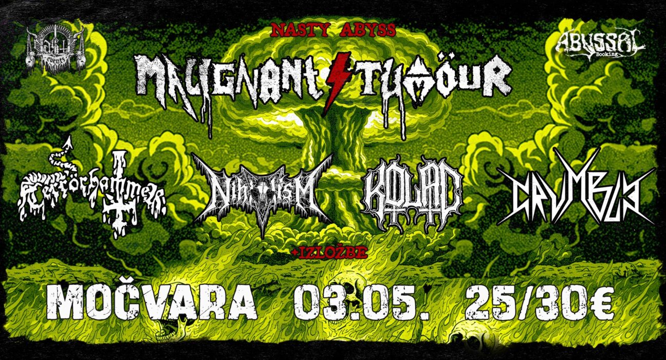 Na početku bješe grindcore a na posljetku bješe metal rock ‘n’ roll crust d-beat holokaust. Nakon 13 dugih godina napokon će zloćudni rock ‘n’ roll mutanti izići iz svoje tople kanalizacije direkt na ključalu pozornicu najdražeg nam kluba u Zagrebu – Močvare! Zadnji puta smo ih imali prilike gledati 2012. godine na drugom Buka i Otpor festivalu u paromlinu kada su nas svojim toksično prijetećim rifovljem odnijeli ravno na Jupiter! Nastali sada već davne 1990. u Češkoj, u 35 godina čistog undergrounda prošli su sve i svašta, od hrpetine koncerata, festivala, turneja, izmjena članova, 7 albuma i nebrojenim demosima i splitovima, pa sve do evolucije u vlastitom zvuku. U češkoj su pokupili nagrade za najbolji live bend, za najbolji album godine, otvarali su za Slayer i još hrpu toga. Zvuče i izgledaju kao da sve što rade šutnu nogom, potom nagnu bocu viskija, razbe je o pod, podrignu i odu. Obavezno poslušajte i obratite pozornost na bend iz Ostrave jer oni su što većina današnjih bendova nije – kako mjuzom tako i ideologijom – „ONI SU METAL“ Malignant Tumour.