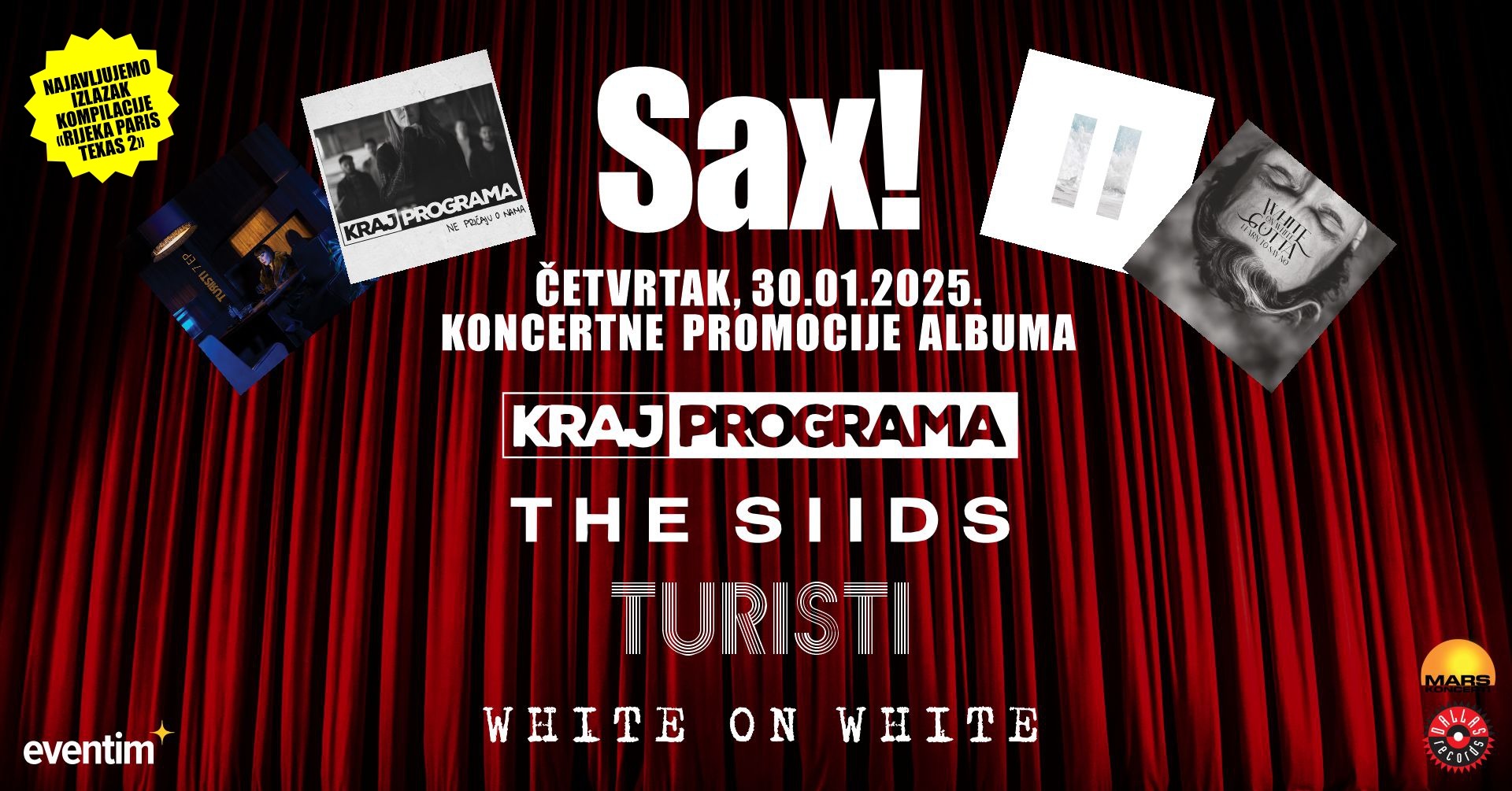 Na koncertnoj promociji u Saxu, 30.1. svirat će nam riječki The Siids, Turisti, White on White i Kraj Programa koji predstavljaju svoje novo objavljene albume i najavljuju veliku kompilaciju Rijeka-Paris-Texas 2, na kojoj će se naći i njihove pjesme.