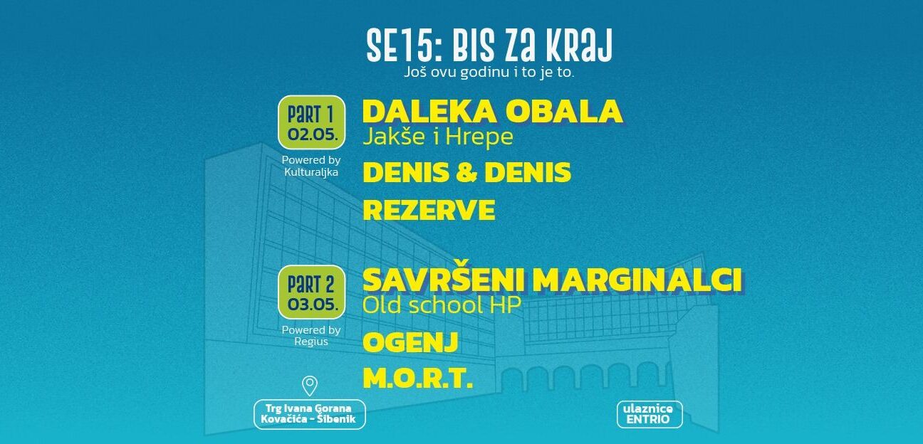 Produženi praznički vikend, 2. i 3. svibnja, u Šibeniku donosi dva dana glazbenog programa u samom centru grada, na Trgu Ivana Gorana Kovačića. Povod su tradicionalni šibenski glazbeni projekti Kulturaljka i Regius, koji ove godine obilježavaju 15 godina kontinuiranog održavanja. Pod nazivom SE15: Bis za kraj, događaj u organizaciji šibenskog PARK kolektiva najavljen je kao veliko slavlje – ali i oproštaj, jer će to ujedno biti i njihovi posljednji koncerti.
